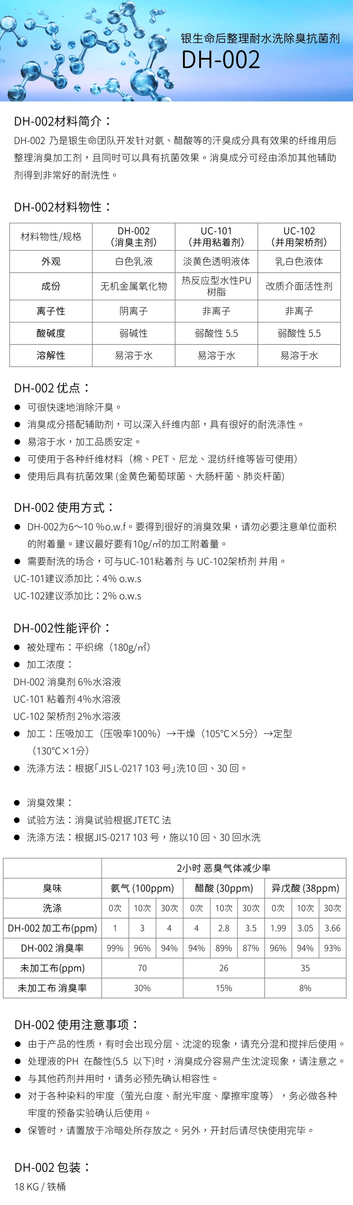 后整理耐水洗除臭抗菌剂, DH-002, 氨, 醋酸, 汗臭, 纤维用, 抗菌, 耐洗性, 抗菌