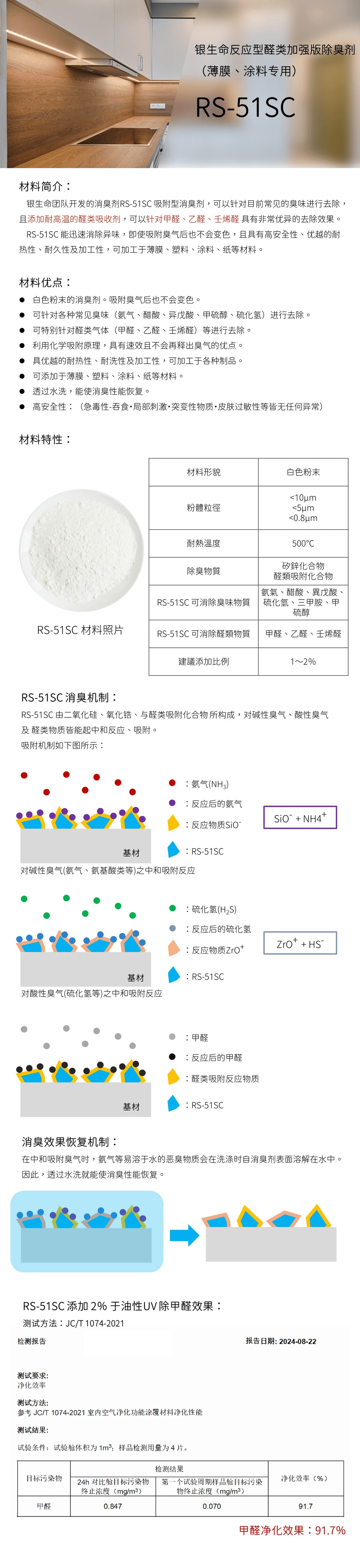 醛类, 反应型, 除臭剂, 科亚, RS-51SC, 吸附型, 耐高温, 甲醛, 乙醛, 壬烯醛, 异味, 臭气, 高安全, 耐热, 耐久, 加工, 薄膜, 塑胶,涂料, 纸, 材料, 白色, 粉末, 不变色, 氨气, 醋酸, 异戊酸, 甲硫醇, 硫化氢, 水洗, 高安全